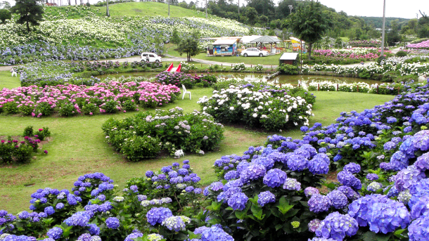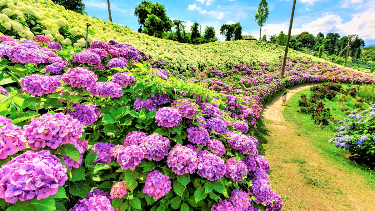 53品種77,700株のあじさいが広大な丘陵地に咲き誇り、