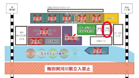淀川河川敷内のほとんどのエリアが有料観覧席ですので、ゆったりご覧いただけます。