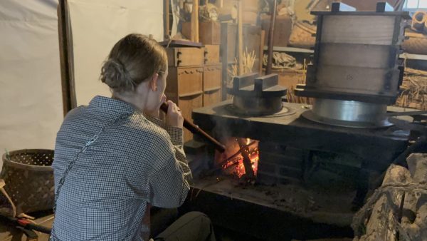 お昼ご飯の間に発酵した茶葉を、信楽焼の陶板で丁寧に乾かします。甘い香りが漂います。