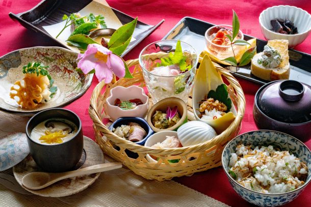 【料亭ゆう月】 本ツアー最大の贅沢ポイント。庭園に面した唯一無二のお席をご用意。 窓一面に広がる紅葉を眺めながら、旬の食材を盛り込んだ「季節の花御膳」をゆったりとご堪能いただけます。 さらに、食後には庭へ降り立ち、秋の風景をお楽しみいただけます。 五感で味わう贅沢なひとときが、心に残る旅の記憶となること間違いなし! |