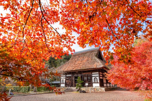 【安國寺】 境内を彩る約100本の紅葉が一面を染め上げる圧巻の景色。茅葺きと紅葉の彩りが、訪れる人を魅了します。 さらに、現地ボランティアガイドによる丁寧なご案内付きで、歴史や見どころをより深く味わっていただけます。 |