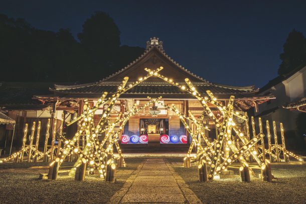 放置竹林の竹を活かした温かな光が、紅葉と歴史ある寺院を美しく彩ります。